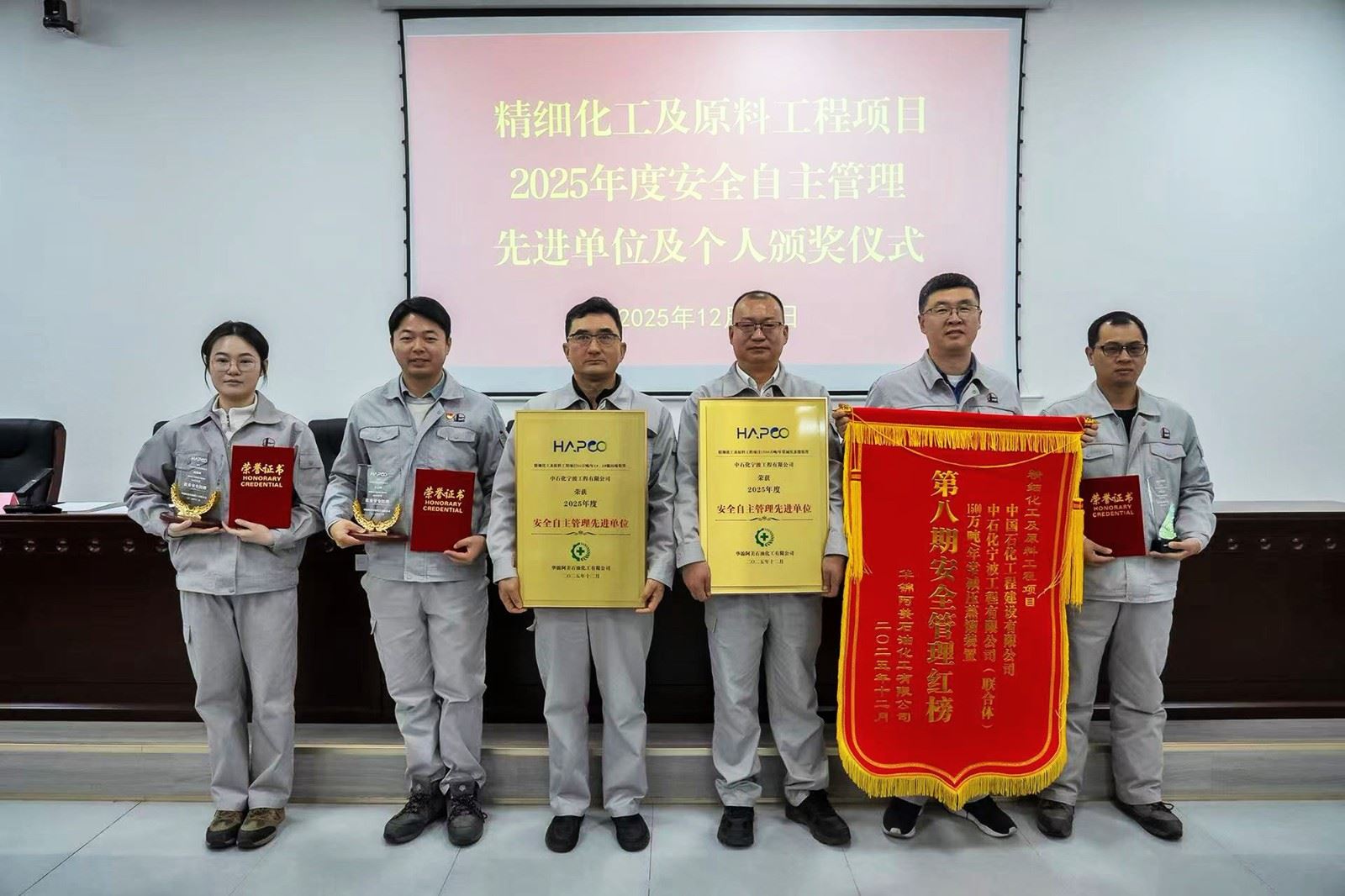 12月30日,华锦阿美召开第八期项目安全联席会暨2025年度安全工作总结表彰大会,对安全工作中表现突出的集体与个人进行表彰。宁波工程荣获“2025年度安全自主管理先进单位”,并累计8次获评“安全管理红榜单位”,成为全场获红榜次数最多的承包商。员工方云锋、高珊珊被评为“优秀安全经理”,詹启义荣获“安全先进个人”。