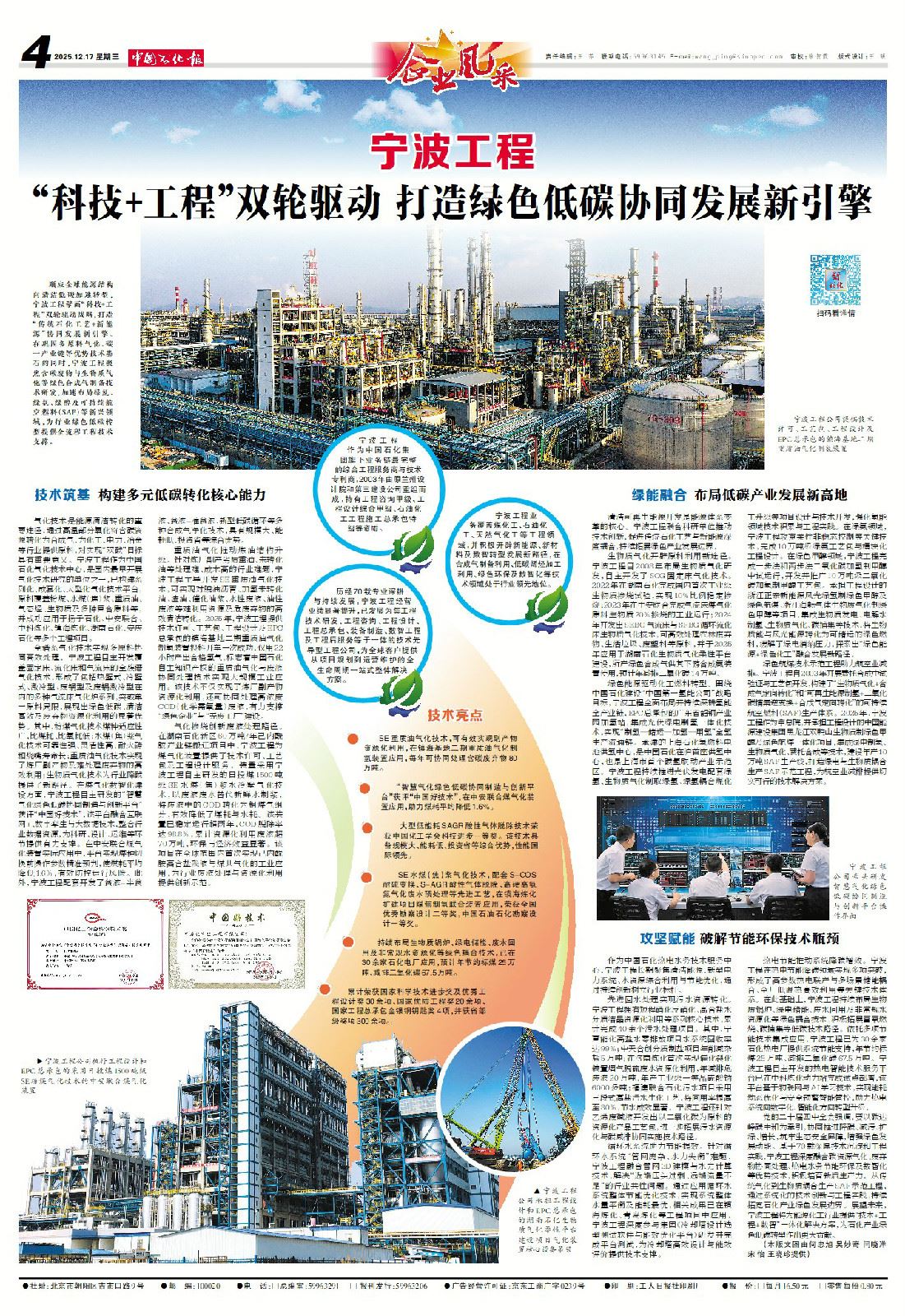 《中国石化报》近日刊发专题文章《宁波工程“科技+工程”双轮驱动 打造绿色低碳协同发展新引擎》。全文如下: